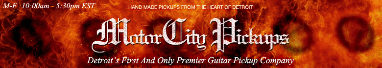 Motor City Pickups is located in the heart of Detroit City, specializing in custom made - scatter-wound pickups. We offer Humbuckers, P90's, and Single Coil pickups in four distince categories, to suite a wide variety of playing styles, from classic blues to extreme modern metal. High Quality Materials Motor City Pickups uses the highest quality materials. We don't try to cut costs by using cheap metals or wire - no "bargain bin" materials like some other companies. We use different point carbon steels and irons per model to get different results in tone. True electrical iron keeper bars and slugs/screws. Nickel-silver covers and hard northern maple spacers. And as always, custom made genuine nickel-silver covers. We'll not use the term "Soft Iron" as it is misleading and currently there is no formula for this metal in the machinist industry whatsoever. Our Guarantee Our Guarantee is very simple and straight forward: We promise the absolute best pickups on the market - period. All of our pickups are guaranteed for LIFE to the original purchaser to be free and clear of any defect against craftsmanship. Updates Wiring Color Guides Added to website! Click Here To View. |